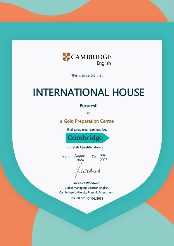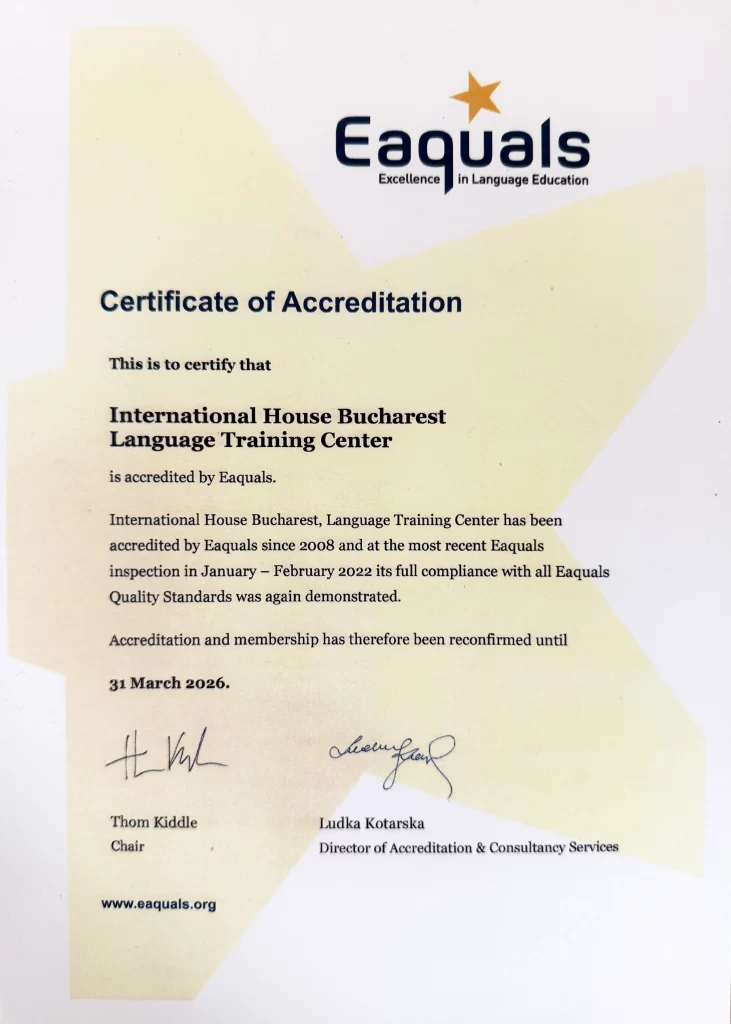 International House Bucharest este acreditată de EAQUALS – Excellence in Language Education, parte din rețeaua globală International House World Organisation și centru de formare profesori Cambridge (CELTA & DELTA). Suntem certificați ISO 9001 și ISO 27001, asigurând calitate, securitate și confidențialitate în toate programele noastre corporate.